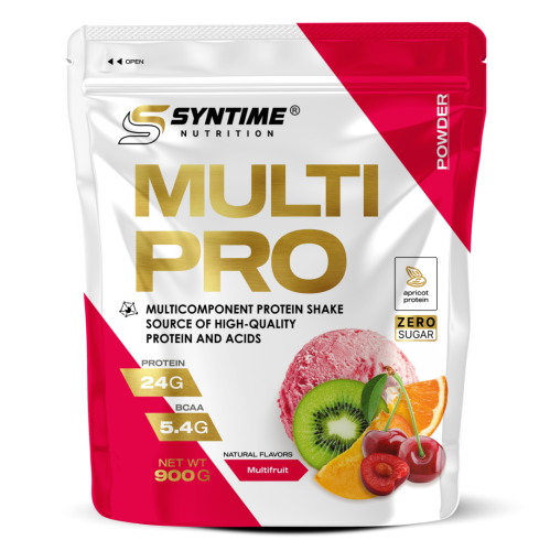 Представляем вашему вниманию мультикомпонентный протеин от Syntime Nutrition Мультикомпонентный протеин известен своей универсальностью, в таких протеинах содержится целый набор различных протеинов, Multi Pro не является исключением В составе содержаться: 1)Сывороточный концентрат (дающий заряд аминокислот в короткий период наделяя энергией) 2)Мицеллярный казеин (который позволяет насыщать организм аминокислотами длительное время) 3)Белок арахиса, абрикоса и подсолнечника (в зависимости от вкуса) белок этих растений в отличии от соевого полезен как мужчинам, так и женщинам и обладает хорошей усвояемостью, а так же содержит полезные жиры и витамины, а его главная особенность антиоксидантное воздействие на организм Multi Pro от Syntime Nutrition прошел лабораторные испытания и полностью соответствует стандартам качества, в составе не содержатся ГМО продукты, консерванты усилители вкуса, сахар и используется только натуральные ингредиенты, как натуральные ароматизаторы и сукралоза