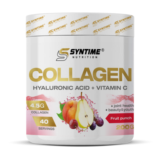 Syntime Nutrition Collagen - строительный материал связок и кожаного покрова человека, он способствует укреплению хряща, связок и костей, улучшает питание мышц, защищает кожу от преждевременного старения, улучшает состояние волос и ногтей и повышает умственную работоспособность В составе содержится так же гиалуроновая кислота, которая способствует регенерации и делению клеток, что способствует заживлению травм и омоложению кожи Витамин С способствует наилучшему усвоению компонентов Collagen Syntime Nutrition